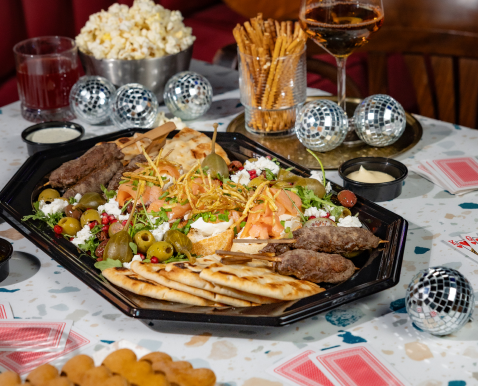 Bruschetta z wędzonym łososiem / Kofty wołowo-jagnięce / Rukola / Feta / Granat /Oliwki / Kapary / Pita / Aioli z pieczonego czosnku / Dip kolendrowy / Salsa verde