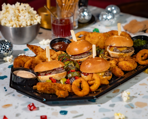 Burgerki z wołowiną, sosem BBQ i serem cheddar / Chrupiące kawałki kurczaka / Grillowane warzywa / Krążki cebulowe / Dip Marie rose / Sos BBQ